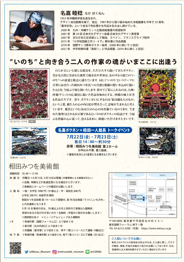 相田みつを作品に名嘉ボクネン作品。どちらも根底にあるテーマに"いのち"の輝きというものが、温かく、力をもらえる時間だったと思います。また見たいなぁと思いました。
